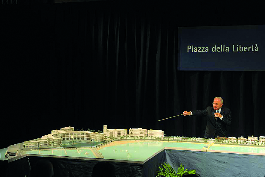 Tutto parte dalla decisione di De Luca, che nella sua longeva carriera di primo cittadino (1993-2001 e 2006-2012) ha da subito voluto puntare sui temi della qualità urbana promuovendo (in un periodo di generalizzato fanatismo politico per le firme internazionali) concorsi di progettazione o incarichi diretti. Dopo quasi un ventennio i risultati non sono affatto convincenti: la stazione marittima di Zaha Hadid, il porto turistico di Santiago Calatrava, la cittadella giudiziaria di David Chipperfield e il Palasalerno di Tobia Scarpa sono opere costruite solo a metà e spesso a rischio fondi; Oriol Bohigas ha proposto parallelamente al Puc alcuni progetti che insieme a quello di Massimiliano Fuksas e di Dominique Perrault rimangono ancora sulla carta. La liquidazione delle parcelle è stata anchessa di cospicue dimensioni (nel caso di Chipperfield un milione solo gli euro non dichiarati, tanto da essere stato condannato a pagare dallAgenzia delle entrate già nel 2009). Le perplessità più forti sulloperato di De Luca si sono concentrate sullinfelice megaprogetto di Bofill del fronte-mare (torre vela da 72 m e crescent) e sulla stessa personalità spagnola considerata da più parti estremamente paludata. Ma De Luca è del parere opposto nonostante la spiaggia di Santa Teresa sia stata divorata dalla cubatura del Crescent assieme a uno spicchio di mare, e ha replicato a modo suo l8 giugno sul proprio sito: «Siamo in una democrazia malata che produce chiacchiere», frase da combattente come le sue precedenti indimenticabili: «Sarà lopera più importante della mia vita», «per fermarmi dovranno spararmi», esprimendo perfino un desiderio da grandeur neoborbonica: interrarvi a tempo debito le proprie ceneri. Il crescent di Bofill ha dimensioni ciclopiche. I suoi quasi 30 m di altezza fanno anche la loro parte ma quello che impressiona maggiormente è lo sviluppo di 300 m che abbraccia linquietante piazza della Libertà. La costruzione ha 50.000 mc di calcestruzzo programmati che conformeranno unarchitettura monumentale disarmante per la sua antistorica imitazione dellestetica classica. Il risultato finale sarà quello di una grande muraglia tesa ad arco i cui effetti ambientali devastanti sono stati spesso denunciati da numerose associazioni locali ma sempre minimizzati da Comune e Soprintendenza, questultima contestata per aver praticato il silenzio-assenso e per non aver richiesto i fotoinserimenti.