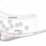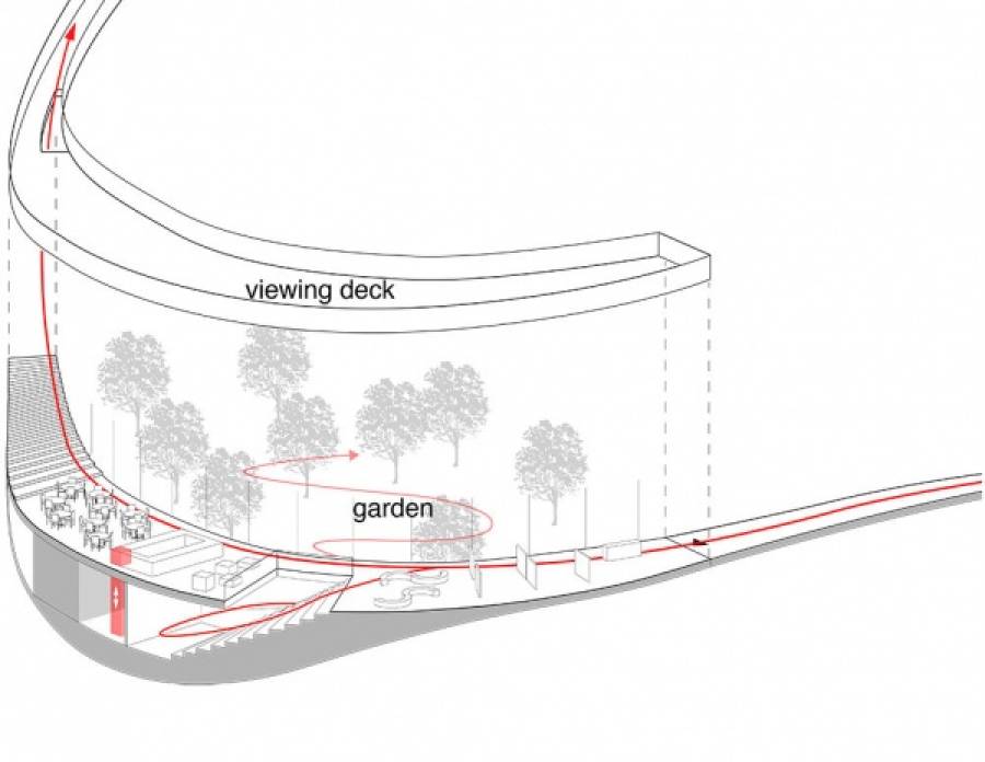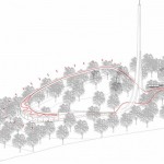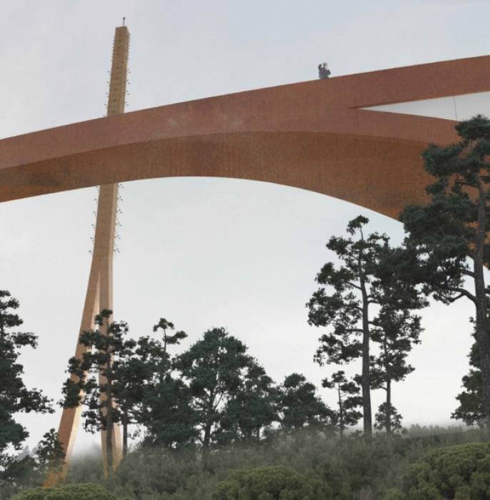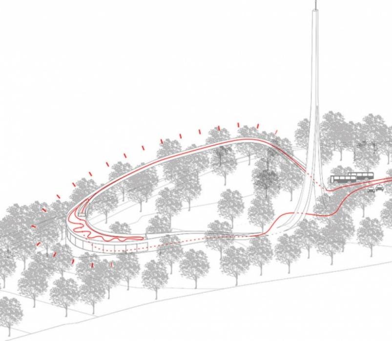 Larchitettura è sita in unarea collinare della periferia cittadina per ridurre i possibili effetti collaterali dovuti alle radiazioni emesse dalla torre. I fruitori potranno percorrere un cammino che s’innalza circondando la struttura: scelta determinata dalla volontà di avere un impatto minimo sulla foresta circostante, generando contemporaneamente unarea che sarà possibile usare come parco, accessibile nei punti in cui il nastro sospeso si ricollega a terra.