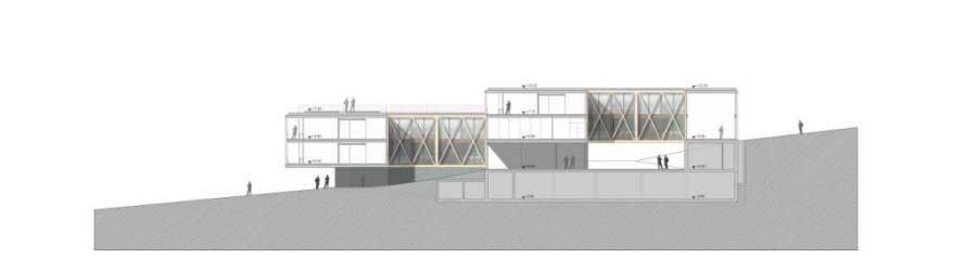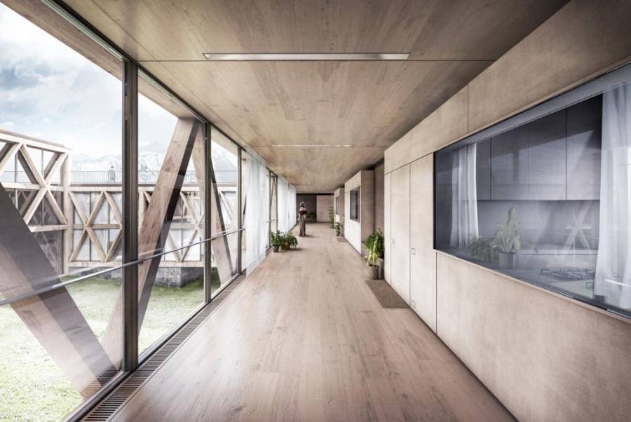Il progetto vincitore (del gruppo guidato dal trevigiano Matteo Bandiera con Fausta Occhipinti e Gianluca Parcianello) istituisce una relazione di continuità con il contesto attraverso due semplici volumi a corte con struttura in legno disposti in modo sfalsato in pianta e sezione e sviluppati su due piani, sorretti da un basamento in calcestruzzo inserito nel pendio e adattato all’orografia del sito. In copertura, un sistema di giardini e piccoli orti (da manutenere a carico degli abitanti della struttura) riduce gli impatti dell’intervento. I volumi sono concepiti secondo un’estrema semplicità funzionale e costruttiva, individuando una scansione modulare grazie alla struttura lignea di 6.5 x 6.5 m che richiama soluzioni costruttive dell’architettura spontanea autoctona. Il volume verso valle ospita 20 appartamenti (10 per piano), più ampi spazi per attività comuni, le cucine e il poliambulatorio. Quello verso monte, da realizzarsi eventualmente in una seconda fase, prevede altri 10 alloggi, la palestra a doppia altezza con la terrazza e i relativi servizi. Seguendo principi di familiarità e adattabilità, i rivestimenti e gli arredi interni sono in larga misura personalizzabili; le chiusure verticali verso l’esterno e il corridoio di distribuzione diventano dispositivi per generare piccoli luoghi abitabili da personalizzare, occasioni d’interazione e incontro. Imprescindibili infine le attenzioni alla compatibilità ecologica dell’intervento: risparmio energetico, comfort ambientale, recupero acque piovane per usi sanitari e irrigui, ottimizzazione degli apporti solari e delle schermature.