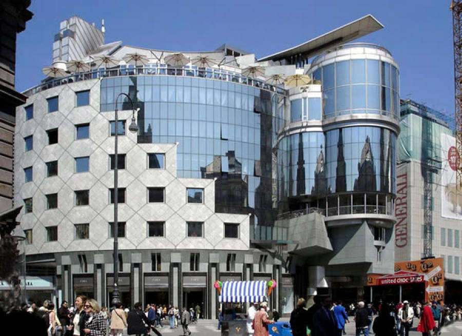 Il primo progetto realizzato da Hollein è una piccola struttura commerciale nel centro di Vienna, il negozio di candele Retti (1965), con il quale si concretizza per la prima volta il suo concetto di architettura globale: dalle insegne alla corporate identity, dallarchitettura degli interni alla configurazione della facciata. Lambiguità che caratterizza il minuscolo fronte della gioielleria Schullin (1972-1974), con la fenditura nel possente rivestimento marmoreo che si metamorfizza nellapertura, diventa dichiarata ironia nel collage dei riferimenti iconici, dalla forte valenza simbolica, nel secondo negozio realizzato per la medesima committenza (1981-1982), o nelle realizzazioni degli interni delle agenzie di viaggio.