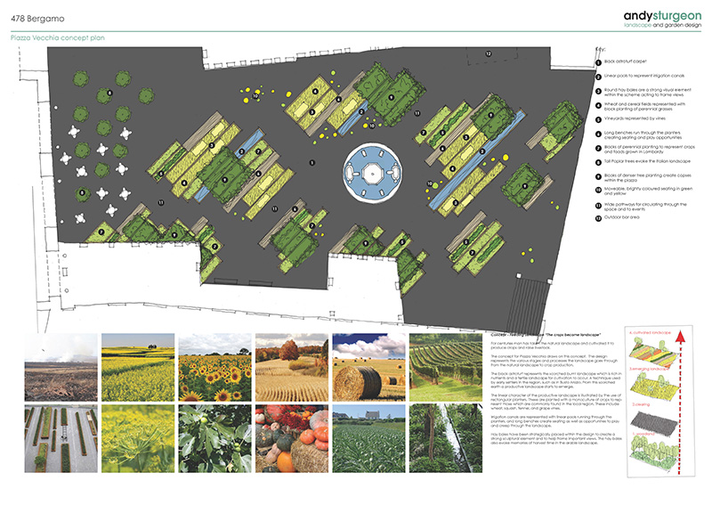 Con una partecipazione che anche quest’anno ha visto coinvolti landscape architect e garden designer di fama internazionale, il nutrito programma è stato animato da workshop, seminari, incontri ed eventi collaterali che hanno spaziato dall’arte all’enogastronomia. La manifestazione, come sempre, ha invaso «fisicamente» Città Alta, provocando l’inedito spettacolo dell’allestimento temporaneo di Piazza vecchia, a cui quest’anno s’è aggiunta anche Piazza Mascheroni. Spazi di pregio e significato della città storica bergamasca, le due piazze sono posizionate sull’asse della pedonale «Corsarola» e, con la loro insolita veste «verde», hanno costituito i fulcri principali della kermesse che ha interessato molti altri luoghi urbani.