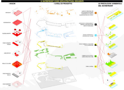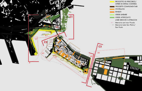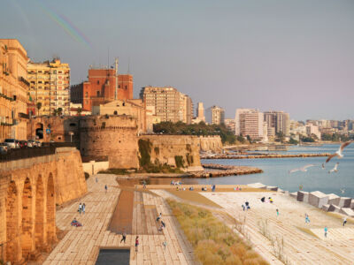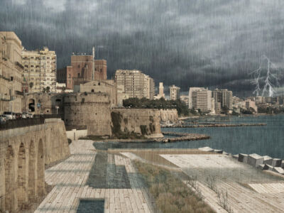 Aria più pesante si respira a Taranto dove, complice la delicata situazione dell’Italsider e la stagnazione economica, l’agenda della trasformazione urbana da tempo non registra fatti di rilievo. Risale al maggio 2008 il concorso bandito dall’Autorità portuale per un Centro servizi polivalente presso il molo San Cataldo, aggiudicato l’anno seguente a un raggruppamento guidato da Rosario Pavia. L’idea premiata prevedeva anche la sistemazione del waterfront a partire dal molo Sant’Eligio. Tuttavia, ogni iniziativa è rimasta sulla carta. Recentemente, almeno sul fronte giuridico e istituzionale, qualcosa sembra essersi sbloccato, grazie al Decreto legge n. 1 del 5 gennaio 2015 (convertito dalla legge del 4 marzo 2015, n. 20). L’Autorità portuale, d’intesa con il Comune e le Soprintendenze MIBACT, tenendo validi il progetto del Centro servizi e l’idea di sistemazione paesaggistica, ha promosso un progetto di rigenerazione del tratto compreso tra il molo San Cataldo e il Castello aragonese situato sull’isola della città vecchia, dal lato del mare aperto. Una sorta di rete infrastrutturale articolata, a spessore e quota variabili, in grado di assumere, a seconda dei contesti, molteplici configurazioni: struttura di protezione dei tratti di costa sottoposti all’azione erosiva del moto ondoso, sistema d’interazione porto-città, percorso pedonale sulla linea di frontiera tra porto, città e mare, spettacolare affaccio sul mar Grande al fine di restituire alla comunità un nuovo spazio pubblico.