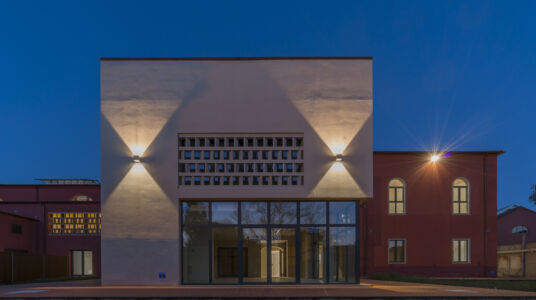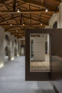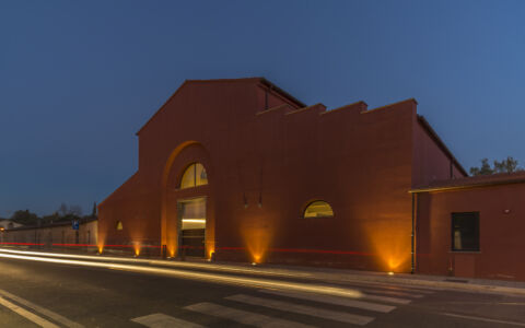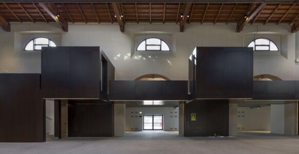 Nel 1999, grazie a un Piano integrato di sviluppo urbano sostenibile (PIUSS) finanziato per il 60% dalla Regione Toscana e per il 40% dal Comune per un totale di circa 4 milioni, si intende annullare l’emarginazione dell’area e trasformare l’archeologia industriale in architettura contemporanea per farla dialogare con la città, anche attraverso il disegno organico del nuovo parco (oltre 100.000 mq) innervato da percorsi e spazi pubblici di verde attrezzato. Come spiega Beatrice Gentili, capo progetto e direttore lavori, il recupero ha scelto di esaltare tutte le addizioni, superfetazioni e asimmetrie volute dall’ILVA nel 1918, quando furono realizzate opere per potenziare il sistema produttivo della ghisa e la sua funzione di Fonderia. Con questa logica, il volume della Torre dei cubilotti – parzialmente demolito nel 1975 ma la cui sagoma rimane evidente a ridosso della parete occidentale dell’edificio – è stato ricostruito e valorizzato come nuovo spazio per accogliere una caffetteria aperta anche alle varie strutture del parco: il teatro della Leopolda, il museo della Ghisa e la Biblioteca comunale. Per denunciare senza equivoci il suo essere nuova addizione a servizio del nucleo storico, è stato scelto un intonaco chiaro, a contrasto con il rosso terra bruciata dei fronti dell’antica fabbrica. Il dialogo tra antico e nuovo è tema centrale del progetto, ancor più evidente negli interni che conciliano il restauro filologico di un edificio vincolato dalla Soprintendenza con la composizione dei nuovi spazi e funzioni. Due grandi portali, uno prospiciente via Roma, l’altro sul fronte nord-ovest, accolgono il visitatore introducendolo all’interno di una «piazza coperta» delimitata da un «grande mobile». Il progetto degli interni, ispirato dall’immagine evocativa di «San Girolamo nello studio» di Antonello da Messina, ha visto l’inserimento di una «macchina scenica» indipendente all’interno della fabbrica storica, dichiarando l’autonomia dei due volumi e delle loro funzioni. Tre cubi lignei scandiscono il ritmo della navata centrale esaltandone la prospettiva: tre nuovi volumi che, come un’architettura nell’architettura, rimodellano lo spazio con quella connotazione scenografica idonea a un nuovo luogo per l’arte e la socializzazione.