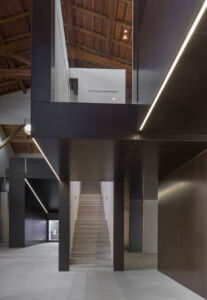 Fonderia 1 è un progetto globale che dal piano urbanistico arriva ad affrontare temi di dettaglio, come la progettazione integrata del sistema illuminotecnico. Quest’ultimo, studiato insieme a Targetti, ha ricoperto un ruolo di grande rilievo anche per la difficoltà di ipotizzare le fonti luminose in uno spazio che doveva mantenere la massima flessibilità per l’allestimento di eventi d’arte ma anche di tipo fieristico. Oltre all’illuminazione naturale proveniente dai due lucernari in copertura e dalle lunette alte lungo le navate, il progetto ha previsto un’illuminazione integrata all’arredo che ne sottolineasse le forme e le fughe geometriche. Con questa logica di intenti si sono impiegate gole luminose con reglette fluorescenti LED che sottolineano i profili degli aggetti dei cubi lignei e il ritmo a pavimento degli archi della navata centrale. I fasci luminosi orizzontali sono rafforzati dalla luce dei proiettori ancorati alle capriate della copertura. L’integrazione delle sorgenti di luce con il progetto architettonico ha previsto un accurato disegno esecutivo del «grande mobile» che enfatizza così il suo ruolo di quinta scenografica.