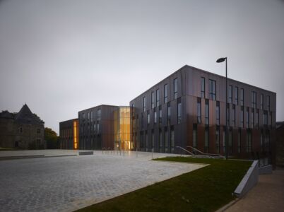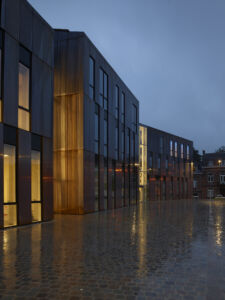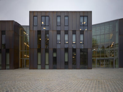 Il secondo elemento di interesse è costituito dall’uso dei materiali. Facciate e coperture sono interamente rivestite in rame: una pelle la cui patina introduce nel progetto la questione non secondaria della vita dell’edificio – una riflessione sui termini di perennità e mutevolezza in architettura. È il tempo, ci dice Simone Gobbo, che diventa progettista dell’opera. Il materiale scelto si dimostra atto a un mimetismo atmosferico e ambientale: l’intenzione è quella di riprendere i toni dell’architettura locale in mattoni reinterpretandoli in un materiale contemporaneo, «non finito», che fa virtù di un clima adatto all’invecchiamento e all’ossidazione del rame. La stessa istanza di mimetismo detta l’altezza degli edifici, che si adatta alla scala della maison du Bailli, e alcune scelte formali, come il disegno delle aperture verticali. In questo contesto, il risultato formale viene considerato dai progettisti come non prioritario. In effetti, anche gli aspetti formali sono il risultato di un approccio teorico che ha una tradizione consolidata in ambito veneziano, dove i tre titolari di DEMOGO si sono formati: accanto alla ricerca di un linguaggio atemporale, emerge tuttavia un desiderio esplicito di sottolineare la contemporaneità dell’opera nella sua complessità.