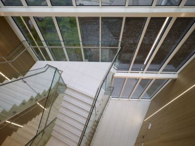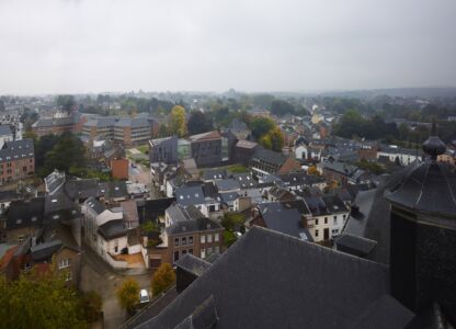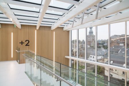 In effetti, una riflessione profondamente sensibile al contesto è la caratteristica centrale del progetto, messa in evidenza con rara coerenza e chiarezza dagli autori. In fase di concorso, gli edifici del nuovo municipio sono pensati per mettere in valore le emergenze monumentali della cittadina – il beffroi [campanile] patrimonio Unesco, l’église décanale e la maison du Bailli – attraverso dei cannocchiali prospettici puntati verso le architetture storiche che diventano esse stesse elementi centrali della composizione. Anche la scelta di frammentare l’impianto e il programma funzionale in tre edifici distinti segue questa logica assai delicata di dialogo con le preesistenze, di ricerca di una giusta misura nella scelta della scala urbana. Più evidente nel progetto di concorso, una chiara strategia urbana avrebbe permesso di creare nuovi percorsi trasversali, secondo il motto regarder à travers. L’intenzione iniziale di mettere in comunicazione diretta il Parc d’Épinal – contestualmente riqualificato -, davanti al municipio e la maison du Bailli, con il centro urbano – potenzialmente rivitalizzando quest’ultimo attraverso un collegamento con la parte alta della città – cede tuttavia il passo nella versione realizzata ad altre priorità: gli aspetti funzionali di un edificio amministrativo, la riflessione sui percorsi interni e la necessità di collegamenti protetti tra i differenti servizi. Le aperture diventano diaframmi vetrati e le emergenze monumentali continuano a essere parte integrante dell’edificio, ma solo per chi lo fruisce dall’interno. Questo necessario adattamento a un programma più dettagliato – diverso da quello fornito in fase di concorso – ha come risultato una soluzione semplificata e tuttavia coerente. In questa fase di adattamento del progetto ai desiderata dell’amministrazione ha giocato un ruolo determinante Pierre Sauveur, presidente di Europan Belgio.