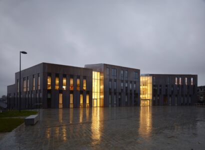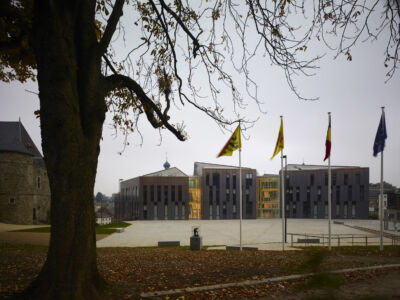 GEMBLOUX (BELGIO). L’hôtel de ville della cittadina di circa diecimila abitanti non distante da Namur, nel sud del Belgio, è l’esito esemplare del concorso Europan 10, lanciato nel 2009 e vinto dal trevigiano studio DEMOGO. Troppo spesso, infatti, la straordinaria esperienza dei concorsi internazionali per progettisti under 40 si conclude in un nulla di fatto nel passaggio dalla carta alla realizzazione. Nella fattispecie, la giuria apprezzò soprattutto le «qualità concettuali» della proposta a scala urbana e la sensibilità al tessuto storico. Gembloux si sviluppa infatti verso il XII secolo, intorno a un monastero, come sito fortificato per il controllo della valle dell’Orneau, non distante dalla principale strada romana della regione.