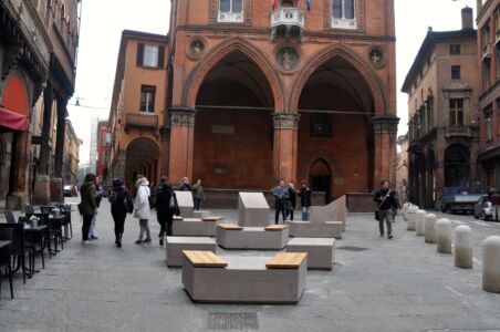 D’altronde sotto le due torri e in Piazza della Mercanzia l’intervento replica acriticamente la porzione fallita dell’allestimento di piazza Verdi realizzato con cubi in granito nero che, appena installati (2012) iniziarono un pericoloso peregrinare notturno nell’area ad aggravarne il disordine a danno della pavimentazione, della loro stessa stereometria e delle improvvisate quanto temerarie manovalanze. Ma se là le sedute corrispondevano a una vocazione storica dell’area, nelle nuove sedi in cui vi si inciampa pare consolino solo un incomprensibile horror vacui dell’amministrazione, a «disordinare» (sotto il profilo cromatico, materico e geometrico) spazi già traboccanti di opportunità e significati.