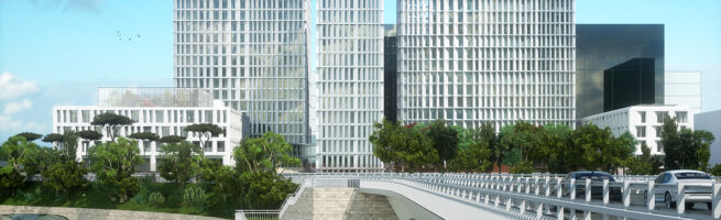 Bandito da Alfiere spa (società mista formata da, a pari quote, Cassa depositi e prestiti e da Telecom Italia), ha visto a luglio chiudersi la fase di prequalifica con l’invito a sei studi: Onsitestudio, Piuarch, PARK Associati, SCAPE Architecture, BiCuadro Architetti e UNO-A Architetti Associati. A settembre quest’ultimo (fondato a Milano nel 2006 da Luca Piraino e Chiara Tardini) si è aggiudicato il primo premio giudando un gruppo composto da Sonia Calzoni e Bruno Egger Mazzoleni architetti associati (progetto architettonico), Paolo Bodega (consulenza bioclimatica), Emanuele Naboni (sostenibilità), Studio Iorio srl (strutture) e General Planning srl (impianti, antincendio, computi). Il lotto d’intervento sorge nel cuore dell’EUR, sul lato settentrionale del laghetto artificiale, e delimitato da via Cristoforo Colombo, viale America, viale Boston e viale Europa. La superficie complessiva è di circa 15.500 mq. La superficie lorda complessiva degli edifici è di oltre 60.000 mq fuori terra e oltre 20.000 interrati. Il complesso è formato da sei corpi di fabbrica: tre torri di 17 piani, due edifici in linea di quattro piani con affaccio ripettivamente su viale Boston e via Colombo, oltre ad un edificio più piccolo di due piani fuori terra che funge da collegamento. I diversi corpi di fabbrica insistono su un basamento comune costituito da un doppio livello interrato. Il costo dell’intervento è di circa 100 milioni, con inizio lavori previsto nel 2017.