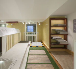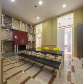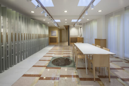 Molti i temi d’interesse: basti citare il pavimento che s’innesta in quello anni ‘90 dialogando senza confondersi; oppure il sistema di quinte espositive che occupano lo spazio senza invaderlo e disturbarlo. Ancora, il grande episodio del camino, o la lavagna e la biblioteca di materiali che accendono l’interesse non senza spiazzarti nel tempo e nello spazio ben sapendo che, nella sala d’ingresso, un ritrovato pozzo messo in luce ti rammenta che siamo nella parte più storica e antica di Milano.