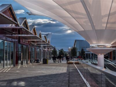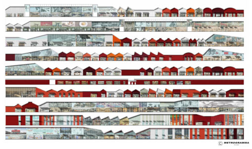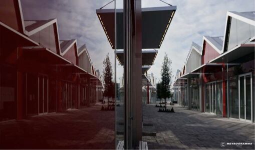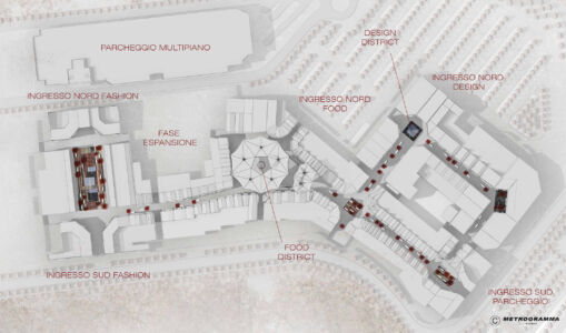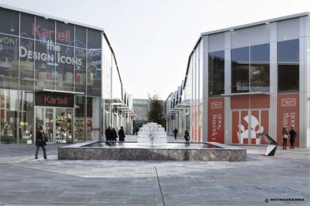 Il progetto è firmato dallo studio Cotefa.ingegneri&architetti, mentre la direzione artistica – inerente facciate e arredo urbano – è stata curata dallo studio Metrogramma che, sulla base degli edifici già progettati da Cotefa, di cui conserva solo le dimensioni e lo skyline dei volumi, ha ridisegnato i fronti con un sistema d’involucri vetrati che caratterizzano l’ambiente. Un ricercato intervento che dona finalmente un aspetto contemporaneo a questa tipologia commerciale. Infatti, stando al progetto iniziale, avremmo rischiato di ritrovarci nell’ennesimo “non luogo” neostoricistico, come ad esempio nell’outlet di Serravalle Scrivia.