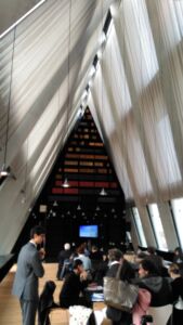 Primo e secondo piano. La sala polifunzionale è piazza contemporanea aperta alla città e si configura come un grande spazio pronto a tutto, ma soprattutto pronto ad essere chiuso alla vista esterna da grandi tendoni che devono bilanciare le enormi vetrate con le quali dovrà lottare chi allestirà questa piazza.
