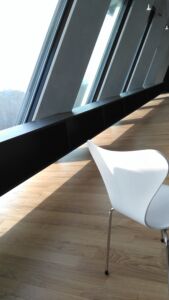 Quinto piano. In un mondo singolarmente triangolare e sghembo, adornato di morbido rovere e tende plissettate, si colloca la sala lettura, aperta al pubblico anche se la capienza è limitata, sulla quale veglia la bandiera della Comune di Parigi esposta in una teca a parete, quasi laica reliquia. Triangolari sono le lampade e triangolari i mobili, anche se sorge spontanea la domanda: chi mai consulterà i libri posti a molti metri di altezza sulla guglia della libreria? Evidentemente anche i libri della Fondazione hanno la loro valenza estetica. Grande la cura costruttiva, ottimi i dettagli: “tutto a disegno” nella migliore tradizione milanese interpretata magnificamente dalle aziende coinvolte, anche come partners, nella costruzione di questa grande cattedrale laica esoterica che non mancherà di portare ulteriore fama a Milano.