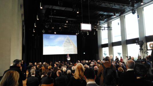 Ma, ammonisce Gad Lerner, gran ciambellano dei discorsi ufficiali, qui la forma è sostanza ed ecco Jacques Herzog ad illustrarci l’architettura che, in ogni caso, non può essere disgiunta dalla visione politica e sociale propria del mondo Feltrinelli. Se per l’illustre premio Pritzker i riferimenti sono all’architettura milanese più aulica da una parte, il gotico del Duomo, e a quella popolare dall’altra, da Aldo Rossi al Gallaratese alle cascine lombarde, il sindaco Giuseppe Sala prova a citare la serialità delle fabbriche lombarde, ma ciò che ci accoglie oggi in Viale Pasubio è pur sempre una palazzata imponente anche se politicamente corretta. Ma i quattrini sono stati spesi benissimo, secondo il giudizio di Giuseppe Guzzetti, grande mecenate dell’operazione grazie alla Fondazione Cariplo che da più di due decenni sostiene finanziariamente la Giangiacomo Feltrinelli e promette di farlo anche in futuro. Sostegno alla cultura anche da Regione Lombardia che, nelle parole del presidente Maroni, vede con interesse la struttura di Porta Volta che contiene la storia, ma guarda al futuro. In testa ed in coda vengono letti i messaggi benauguranti del presidente della repubblica in carica e di quello emerito. Conclude l’evento una dotta dissertazione sull’utopia dell’astro nascente Rutger Bregman, giornalista/pensatore olandese di 28 anni, e l’interpretazione da parte del Toni Servillo nazionale del discorso del 1961 con il quale Giangiacomo Feltrinelli inaugurava la precedente sede di Via Romagnosi. In un clima da allegra confraternita il miglior viatico è il saluto col segno di vittoria nel quale Inge Feltrinelli si produce a favore dei fotografi di fronte alla facciata sghemba del preclaro edificio.