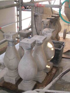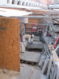 La copertura delle botteghe in lastre di piombo è stata smontata e ricollocata; conservata integralmente, comunque sempre riparata sul lato interno, in modo da non creare disomogeneità cromatiche fra una lastra e l’altra. Le colonnine delle balaustre, tutte rimosse e numerate, dopo il restauro sono state fissate alla base con nuove colature in piombo, prima a caldo, poi ribattute a freddo, mentre in precedenza erano state fissate con colate cementizie molto rigide che ne avevano provocato la rottura.