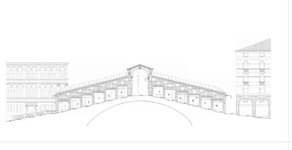 Oggi la struttura mantiene la forma originaria: un unico arco di oltre 28 m di luce tra la Riva del Vin e la Riva del Ferro. L’arco scarica il peso su fondazioni costituite da 12.000 pali di legno d’olmo e tavoloni di larice che, da fine Cinquecento, lo sostengono con le sue 24 botteghe.