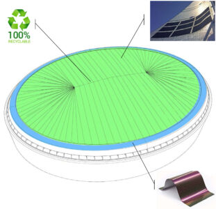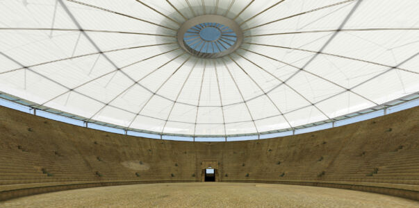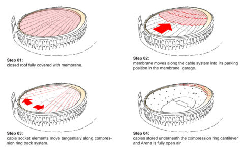 Decisamente più convincente il primo posto del team tedesco SBP e GMP (premio 40.000 euro), anche per l’originalità, sottolineata dalla giuria, della soluzione adottata: anche in questo caso siamo in presenza di un anello posto in appoggio sul perimetro superiore della cavea, a sostegno di una serie di teli retrattili retti da cavi che, a loro volta, in assetto aperto vengono riavvolti nell’anello perimetrale lasciando il cielo interamente libero. Ecco la “riproposizione di un velario tecnologico”, come si doveva inizialmente intitolare il concorso.
