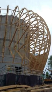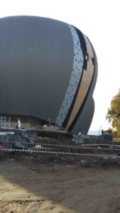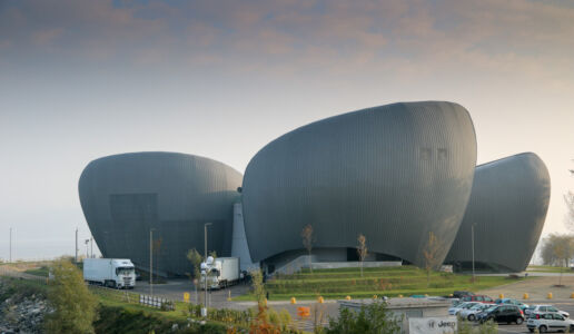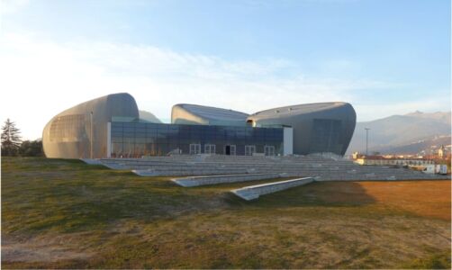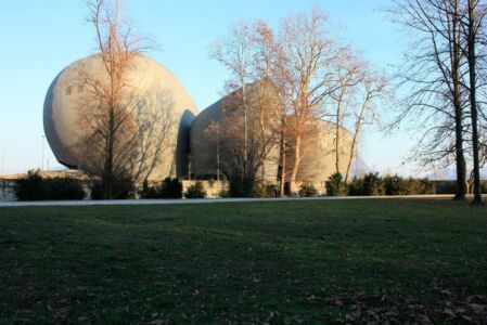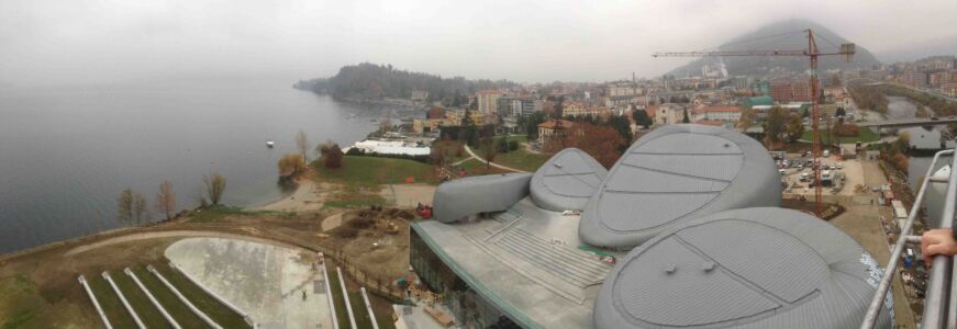 VERBANIA (VCO). Avete letto bene; nessun refuso nel titolo. I quattro grandi ovoidi più o meno sghembi sono l’elemento distintivo del CEM (Centro eventi multifunzionale, ribattezzato «Il Maggiore»), il teatro e polo culturale con servizi che sorge in riva al lago omonimo, terminato circa un anno fa.