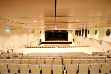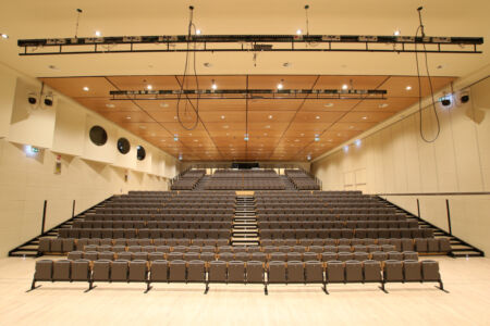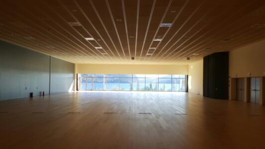 Entrando nel teatro, si nota lo scarto maggiore tra volontà di forma complessiva e configurazione degli interni. La distribuzione relega alla marginalità gli ambiti di servizio, dall’ingresso e biglietteria alle zone di disimpegno dei corpi scala, esaltando invece i vastissimi spazi del foyer (forse eccessivo, ricorda un’anonima sala dei passi perduti dal difficile utilizzo) e della sala principale: spazi multifunzionali e flessibili che, attraverso piattaforme e partizioni mobili, permettono svariate configurazioni (tra cui quella a sala unica in grado di accogliere fino a 900 persone). Foyer e sala (con ampio palcoscenico e fossa orchestrale) sono contenuti all’interno di un volume parallelepipedo dissimulato verso la città grazie ai “sassi”, il quale si rivela invece verso la nuova arena all’aperto – dal disegno paesaggistico – e il lago attraverso la grande parete vetrata panoramica. Tale volume, sospeso, schiude al livello terra uno spazio coperto che, non valorizzato, pare di risulta. E se dal lago l’innesto tra il prisma vetrato e i “sassi” è tutt’altro che risolto, lo spazio ricavato sulla sovrastante terrazza riscatta in parte la composizione.