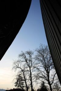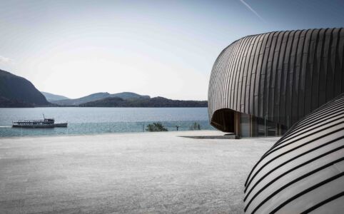 Le accattivanti forme dei “sassi” ben s’inseriscono, a livello cromatico e dimensionale, nel paesaggio lacustre da cartolina. L’aura s’incrina quando si scopre che i grandi involucri in zinco titanio sono indipendenti dai retrostanti volumi, formati da setti verticali in cemento armato impostati su pianta curvilinea. Inoltre, osservando le planimetrie si percepisce la dicotomia tra i perimetri e la partizione interna degli spazi, che risponde invece a mere logiche di ortogonalità.