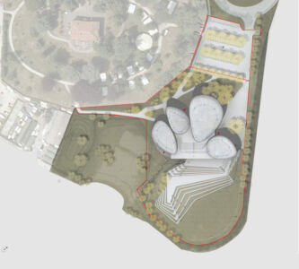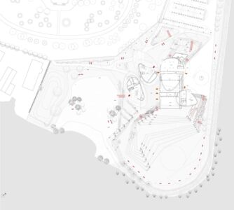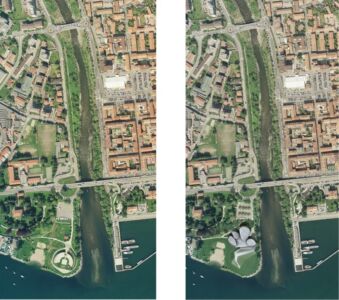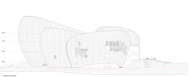 E poi in Italia abbiamo la memoria corta. Così, pochi ricordano (a scala sovralocale, lo ha fatto Edilizia e territorio) che il concorso internazionale bandito dal Comune nel 2007 riguardava un teatro in piazza Fratelli Bandiera, nel centro storico. Poi, nei cambi d’amministrazione, il programma è stato “stornato” in riva al lago – potenziandolo con spazi polifunzionali per mostre e altre attività culturali – su un’area riqualificata negli anni novanta con un parco urbano e un’arena all’aperto, demolita per lasciar posto al nuovo intervento. È stato così redatto un nuovo progetto che non ha mantenuto nulla dell’originario (cfr. il video), se non i morfemi organicisti, ora esaltati nei quattro “sassi”. (Intanto, per la riqualificazione di piazza Fratelli Bandiera, nel 2015 un nuovo concorso – per ora senza seguito – ha visto la vittoria di un gruppo guidato dallo studio associato IGES).