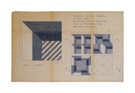 La serie completa di 27 disegni, eseguiti a mano, al tempo ed anche ora, su maioliche 20×20 cm, fu pensata da Ponti per l’Hotel Parco dei Principi di Sorrento che, pagina fra le più belle della storia dell’architettura italiana, fu uno straordinario laboratorio di soluzioni che coinvolsero tutto l’edificio. La collaborazione con la Ceramica D’Agostino permise di declinare in tutte le cento camere, senza dimenticare la hall, la reception, il bar, il ristorante, i decori bianchi e blu in ceramica pensati attraverso una serie di combinazioni “matematiche e geometriche”. Il pensiero di Ponti è anche un memento di una grande verità che sta alla base di tutte le arti compositive: “Date a uno un quadrato di venti per venti e, benché nei secoli tutti si siano sbizzarriti con infiniti disegni, c’è sempre posto per un disegno nuovo, per un vostro disegno, non ci sarà mai l’ultimo disegno”.