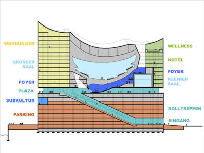 Accanto si dipanano ancora organicamente i differenti spazi di servizio, che numerosi questa architettura ospita: l’ingresso all’hotel 5 stelle-lusso “The Westin” chi si apre sul lato est dell’edificio più con le vetrate che coi timidi balconi a veranda; il bar/caffè che si affaccia sulla città storica sul lato opposto del trapezio; la rampa nascosta di scalette che scendono al ristorante di lusso dal punto di degustazione birre artigianali; il negozio di souvenir, libri e cd; gli ascensori che conducono ai 150 posti dei Kaistudio per lo studio, gli eventi e workshop a tema musica sperimentale, così come ai 7 piani per 500 posti di parcheggi nel basamento e infine ai 44 appartamenti di lusso, personalizzati da celebri designer.