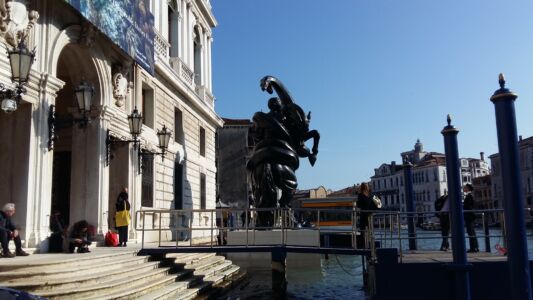 La scultura che ti accoglie a Punta della Dogana, novello omaggio al Laocoonte vaticano dal titolo “The Fate of a Banished Man (Standing)” ricavata da un blocco unico in marmo del peso di 120 quintali con basamento poggiante su soletta in calcestruzzo (previa rimozione dei masegni) sarebbe già sprofondata in laguna assieme a quella che ci accoglie all’approdo di Palazzo Grassi sul Canal Grande se un nutrito gruppo di tecnici non avesse messo a punto ed eseguito opere di consolidamento non convenzionali.