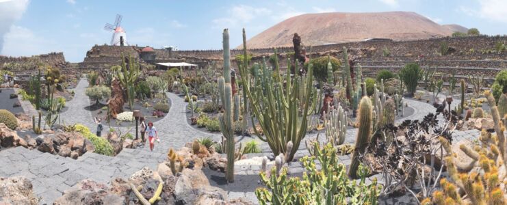 Il Jardín de Cactus è insieme un giardino botanico-scientifico, un micro-paesaggio che racconta una micro-storia tipicamente canaria, ma anche una specie di enorme collage a tecnica mista, che monta assieme e impasta le piante con le pietre, la scura terra lavica coi brillanti colori a calce, e perfino le forme vernacolari “trovate” di un mulino a vento, secondo una logica quasi da bricolage, che si arrischia a sfiorare la naiveté.