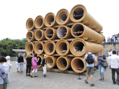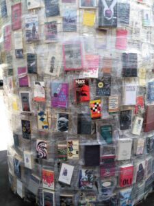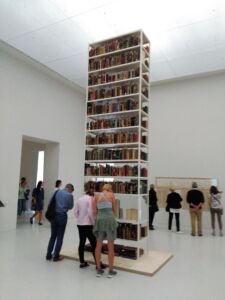 L’opera di Marta Minujin, al di là dei significati e della storia che si porta con sè – già realizzata nel 1983 a Buenos Aires (El Partenon de libros prohibidos era là alle prese con un’altra dittatura) il Parthenon of Books sorge qui a Kassel ove i nazisti bruciarono migliaia di libri ed è a sua volta costituito da libri messi al bando donati dalla cittadinanza (ma quale tenerezza abbiamo provato nello scoprire fra Marx e Solženicyn una copia in tedesco delle Novelle di Matteo Bandello!) – pare proprio trovare forza e diventare simbolo in questo attuale allestimento che, riproponendo un’architettura classica quasi come modello in scala 1:1, assume una valenza ambientale e urbana che, forse, va anche al di là delle intenzioni dell’artista. Possiamo quasi dire che l’allestimento travalichi l’opera, il contenitore diventi contenuto e, al fine, opera esso stesso lasciando ai libri il ruolo di un interessante corollario.