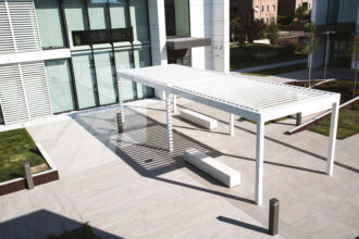 Le strutture, immerse in un ambiente naturalmente luminoso, si snodano come parte di un tutt’uno uniforme, tra naturale ed artificiale.