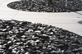 Le tecniche di produzione più avanzate di GranitiFiandre hanno portato a superfici estremamente strutturate, e per tutte le pavimentazioni esterne è stato scelto Porcelaingres, IN_WOOD per i vialetti e Fiandre NEWSTONE per le piazze e le terrazze. Entrambe le collezioni richiamano rispettivamente la consistenza degli elementi naturali, le venature del legno e la ruvidità delle lastre di pietra. Wood, in colore molto chiaro, evidenzia marcatamente la linearità dei flussi, mentre i toni antracite della pietra offrono un contrasto cromatico deciso con la vegetazione circostante e con il paesaggio urbano.
