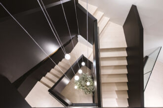 Per sottolineare l’aggiornato e arioso space interno sono stati scelti i prodotti Fiandre HQ RESIN MAXIMUM 6 mm, Porcelaingres JUST CEMENTI e IN_WOOD 8 mm. Per le scale, che rappresentano una caratteristica interna speciale e distintiva in tutti gli edifici, sono stati personalizzati pezzi speciali per i gradini sospesi, rivestiti su tutti i lati con DARK HQ.RESIN MAXIMUM. Grazie ad un taglio raffinato e sofisticato ed al lavoro di posa è possibile ammirare la vista della rampa nella sua parte inferiore mentre si sale.