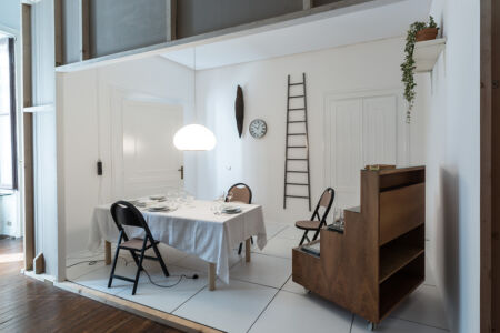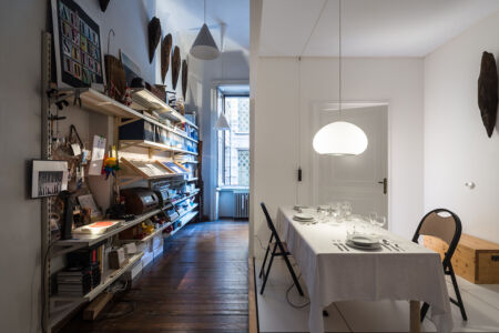 Ogni anno viene riallestito un particolare progetto dei Castiglioni che fu realizzato in occasione di mostre collettive. Vengono ricostruite così delle piccole stanze attraverso un’accurata ricerca tra il prezioso materiale di archivio, in modo che ogni minimo dettaglio riproduca esattamente il pensiero dei due maestri. Nello scorso 2016 era stato riproposto “Ambiente di Soggiorno” che Achille e Pier Giacomo avevano realizzato per la mostra “Colori e forme della casa d’oggi” (Villa Olmo, Como, 1957) mentre quest’anno viene presentato “Ambiente arredato per il Pranzo”, progettato per la mostra “La casa abitata” (Palazzo Strozzi, Firenze, 1965) dove insieme ad altri illustri progettisti provarono a dare forma alle nuove esigenze dell’abitare. Ambienti originali che esprimono il loro particolare punto di vista sull’argomento; come nella stanza che in questo momento è in scena tra le mura dello Studio/Museo Castiglioni, un luogo magico che custodisce meraviglie progettate da loro ma anche la grande raccolta di oggetti anonimi, importante fonte d’ispirazione. “Ambiente arredato per il pranzo” è simile a una grande scatola che s’inserisce perfettamente nello spazio esistente, come se fosse sempre stata lì ed è posizionata esattamente come era stata pensata per Palazzo Strozzi, ovvero in modo da poterla guardare solo frontalmente, ricostruendo così il punto di vista immaginato. È una sala da pranzo perfetta, dove tutto è in ordine ma allo stesso tempo avvertiamo e riusciamo ad immaginare dei movimenti: una sedia appena spostata dal tavolo ed una che invade quasi il passaggio tra questo ed il loro geniale mobile/contenitore “Rampa”, lievemente ruotato come indicato sui disegni di progetto e, infine, una tavola non ancora completamente apparecchiata, perché i Castiglioni non volevano darci un’immagine “ingessata” di questo spazio. È ricostruita fedelmente anche la porta semiaperta, che ci fa immaginare che al di là possa accadere qualcos’altro. Molti degli oggetti presenti sono stati da loro progettati, come la sedia Tric (riprogettazione della storica Thonet degli anni ’30), la lampada a sospensione Black & White e i bicchieri per Alessi, mentre altri sono oggetti recuperati, come la scala (lasciamo scoprire ai visitatori della Fondazione la sua funzione) ed il posacenere da muro delle ferrovie, posizionati nello spazio in un delicatissimo gioco di equilibri.