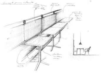 Sarà nuovamente valorizzata anche la Locanda Giustini, connessa all’hotel attraverso il bar: iconico locale di Cascia che intende diventare luogo d’incontro per la popolazione locale. Il bancone del bar, così come le lampade, sono di recupero, mentre i prodotti locali e i vini della regione saranno valorizzati in una cantina a vista che avrà funzione di filtro tra il bar e il ristorante. La locanda, realizzata in legno, ferro, pietra e pelle, godrà della vista sulle montagne attraverso l’utilizzo di grandi vetrate.