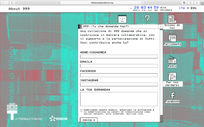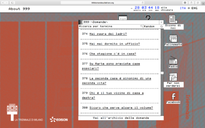 Le 999 domande sono accessibili dal sito progettato appositamente e in sintonia con i pensieri di Mirti che, fin dall’epoca di studio Cliostraat e del primo IdLab con Walter Aprile, ha sperimentato un doppio format: da una parte la rappresentazione fisica dell’idea progettuale con strutture temporanee, come accade in Triennale, con una serie di elementi tubolari a definire una serie di scaffali aperti ed incrementabili e dall’altra l’interazione con i visitatori dal vivo e attraverso il sito web, possono formulare altre domande sull’abitare; come se 999 non fossero sufficienti. Una modalità enciclopedica che tuttavia costringerà Mirti a una sintesi che raccolga le istanze da lui provocate nel pubblico live e da remoto.