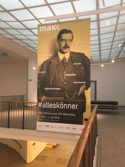 La più importante e ricca delle tre, all’interessante Museum für angewandte Kunst-Köln (a due passi dalla cattedrale di Colonia), è, senza tema di cadere in eccessive lodi, strepitosa: espone 230 oggetti di grande bellezza – molti inediti – in 8 sale tematiche, fra dettagli tipografici di logo e monogrammi e caratteri di neo-invenzione behrensiana, disegni e dipinti, progetti di architettura amatoriale di successo dei primi anni e design industriale ante-litteram, strumenti musicali e mobilia, carta da parati e tovaglie, tutto il mondo della AEG-Allgemeine Elektricitäts-Gesellschaft per cui lavorò -factotum creativo dal 1907- progettando bollitori elettrici, lampade, radiatori, manifesti e poster, articoli di cancelleria e francobolli pubblicitari. Focus della mostra è la produzione di passaggio dallo Jugendstil alla Neue Sachlichkeit (1894-1914) dove solo le architetture non possono (giocoforza) essere presenti in corpo, ma ovunque accompagnano il pubblico nel percorso attraverso le sale, con la pluricitata opera prima, l’Haus Behrens (1901) alla colonia di artisti di Ernst Ludwig von Hessen a Darmstadt o la Tonhaus “in der Kölner Flora” (1906, Colonia) entrambe progettate “im Sinne harmonischer Gesamtkunst”, fra celebri “caffettiere che ridono” e preziosi dettagli di introversione domestica nordica.