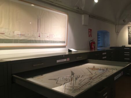 Il display con il quale si sviluppa la mostra, già attivato nel 2017 per l’esposizione su Ettore Sottsass, consente di entrare dentro le architetture di Ricci, attraverso il gesto dell’apertura delle cassettiere che, come forzieri, conservano i disegni tecnici e a mano libera di alcune tra le sue più importanti architetture. Tra questi i disegni di Monte degli ulivi: l’Ecclesia, lo spazio mai realizzato, la cui origine greca significa “assemblea del popolo”; i disegni delle piante dell’asilo e della scuola materna dove si percepisce in modo chiaro l’atteggiamento “organico” di Ricci di appartenenza e generazione dello spazio dalla terra. Proprio questa sua idea di architettura organica si discosta dal lessico wrightiano. Infatti Ricci usa la pietra sia per una scelta necessaria dovuta alla scarsità di risorse e di manodopera specializzata, sia come elemento linguistico che riesce a far levitare leggero annullandone la pesantezza materica. L’altro tema riguarda l’autocostruzione dei primi e più sperimentali progetti, le due opere valdesi e Monterinaldi, mentre le opere pubbliche come l’intervento residenziale a Sorgane, insieme all’amico e sodale Leonardo Savioli, pur mantenendo inalterato il carattere dell’architettura ricciana, risultano di un livello costruttivo più elevato.