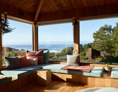 La storia agricola del sito e i granai esistenti hanno ispirato le prime strutture di Joseph Esherick chiamate “Hedgerow Houses” coperte da austeri tetti verdi. William Turnbull diede un primo contributo attraverso le sue proposte per il layout del sito nel 1964 e per le “Cluster Houses”. Ma il carattere e le intenzioni dell’insediamento furono stabiliti attraverso il “Condominium 1”, il complesso abitativo situato all’estremità meridionale di Sea Ranch che fungeva da vero e proprio manifesto architettonico. Queste erano le caratteristiche del linguaggio dello studio MLTW, teorizzato nel volume The Place of Houses (Gerald Allen, Donlyn Lyndon, New York, 1974), reso famoso sia dal rivestimento in sequoia non verniciato del cubo di 7,3 m per lato che rappresentava la principale caratteristica organizzativa di queste case, disposte in modo irregolare attorno a una corte interna; sia dalle famose “bisacce” aggiunte al cubo, che fornivano una chiara identità alle singole unità abitative. Le bisacce erano orientate in modo da catturare particolari viste sul paesaggio e per riparare dai venti, conferendo un aspetto organico che rifiutava la geometria euclidea. La superficie in pendenza continua della copertura è stata progettata per deviare le tempeste e abbinarsi alla forma scolpita dal vento degli alberi più longevi. Il sublime bosco verde di fronte al vasto oceano blu era quindi dotato di modesti requisiti abitativi. Le caratteristiche paesaggistiche del bosco sono state successivamente migliorate grazie al lavoro di Lawrence Halprin che ha portato il sito all’attenzione pubblica e ha combattuto la suburbanizzazione, aggiungendo anche un elemento di lusso con l’introduzione della piscina comunale (il nome Pacifico smentisce la qualità effettiva dell’oceano le cui acque sono gelide tutto l’anno). Sea Ranch è stato abilmente protetto dai venti, trasformandosi in una scultura ambientale, ed è stato reso vivace dai disegni audaci di Barbara Solomon per gli spogliatoi e gli altri spazi di uso comune. Il logo del sito e la creazione del brand Sea Ranch pensato per aiutare a orientare il visitatore in quello che a prima vista appare come una scogliera, sono stati tutti contributi di Solomon.