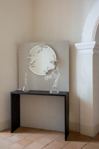Lo studio romano Manufatto, di Ilaria Aprile e Davide Gallina si affida ai falegnami trasteverini per la realizzazione del servo muto “Pietro” in legno e marmo travertino, ispirato al colonnato berniniano della basilica vaticana, mentre l’artista-artigiano vicentino Simone Crestani presenta dei lavori in vetro borosilicato, che rappresentano il punto d’incontro fra la rappresentazione della natura e la dimensione onirica.