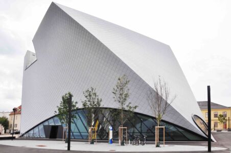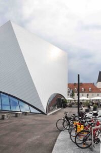 La Landesgalerie è un edificio isolato; un volume cubico segnato da una forte torsione che ne deforma le pareti trasformandolo in una scultura elegante e vibratile. La geometria è generata dalla rotazione di un quadrato di 33 metri di lato, che ruota attorno ad un vertice; la sua dimensione si riduce leggermente, verso l’alto, per dare maggiore snellezza al volume. L’edificio tocca terra solo in quattro punti, negli angoli, grazie a quattro ampie arcate che ne sorreggono il peso. Qualcuno sostiene che il delicato chiaroscuro del suo rivestimento metallico richiami la forma contorta di un pesce che si dibatte nella rete. Non è solo la vicinanza della sponda del fiume a suscitare l’analogia: le pareti incurvate dell’edificio sono, infatti, rivestite da centinaia di tegole romboidali in zinco-titanio che, da lontano, sembrano talvolta squame scintillanti. Altri ne hanno avvicinato la forma alla scultura di una ballerina danzante. Bernhard Marte ha preferito, più prosaicamente, sottolineare la somiglianza di questa complessa copertura metallica con quelle dei vicini edifici storici, anch’essi ammantati di tegole, suggerendo l’immagine di un grande tetto che richiude lo spazio silenzioso e quasi privo di aperture del museo. La torsione delle pareti lascia scivolare la luce lungo ampie superfici curvilinee, producendo risultati di grande effetto, soprattutto se osservate da una certa distanza. Questa è la forza, ma anche il limite del nuovo museo: quando ci si avvicina, infatti, le tegole metalliche appaiono grandi e pesanti, frammentando le belle pareti in torsione. Anche nell’attacco a terra, la soluzione adottata non appare del tutto convincente poiché, per effetto della complessa geometria del volume, le vetrate terminano in alto in una banale grondaia. La passeggiata intorno al volume assicura, comunque, suggestivi squarci aperti fra le grandi pareti incurvate, le sponde del fiume e gli edifici della città vecchia.