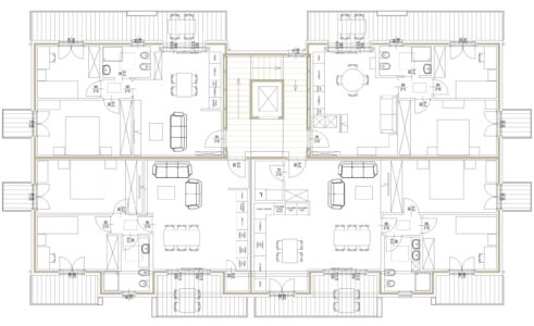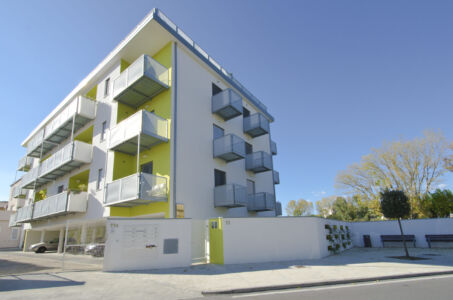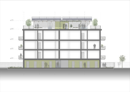 L’edificio sorge su un lotto di forma trapezoidale, con accesso alla viabilità pubblica su uno dei lati corti, e si sviluppa su 5 livelli complessivi, ospitando cantine e posti auto a piano terra, 4 appartamenti per piano nei tre livelli centrali, ambienti comuni, una terrazza panoramica e locali tecnici in copertura. Il tema della sostenibilità è declinato in vari modi: dal disegno degli ombreggiamenti alla scelta dei materiali, alla scelta delle dotazioni impiantistiche. Tramite l’utilizzo di specifici software di simulazione, sono stati analizzati gli ombreggiamenti dell’edificio al fine di verificare la necessità e la tipologia di eventuali elementi schermanti e il posizionamento degli impianti solari.