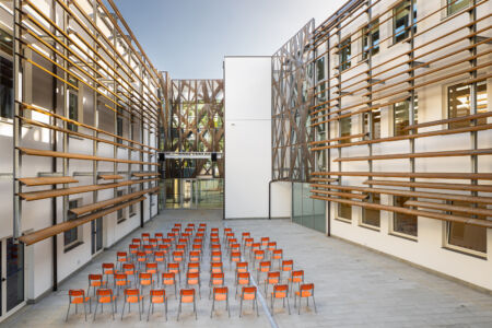 Il principio generativo del progetto deriva dall’unione di tre elementi – l’asse principale di relazione con il tessuto urbano, il verde e l’orientamento – per un’integrazione morfo-tipologica, sociale e formale-compositiva. In linea con la filosofia dello studio ATIproject, l’intervento è stato sviluppato e gestito con un approccio integrato BIM, coordinando i vari elementi e verificando costantemente tempistiche e costi.
