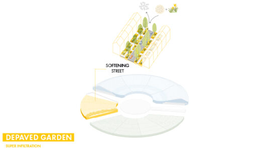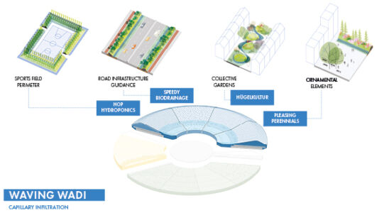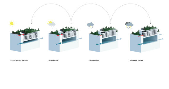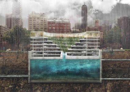 Si chiama così il progetto-prototipo che lo studio danese Tredje Natur in collaborazione con la società d’ingegneria Cowi e con Rambøll servizi finanziari, ha ideato per affrontare gli effetti di uragani e alluvioni negli ambienti urbani. Esso risponde a tre differenti esigenze: accumulare l’acqua in eccesso in occasione d’inondazioni; costruire parcheggi multipiano nel sottosuolo dei centri urbani; realizzare spazi verdi in città. Ambientato in St. John’s Park, secondo i progettisti si tratterebbe di costruire un grande volume sotterraneo capace di ospitare un parcheggio multipiano che, in base alle esigenze, si solleverà e sarà anche in grado d’immagazzinare l’acqua in eccesso. La struttura di sostegno del parcheggio, attraverso un sistema di scorrimento idraulico e grazie alla spinta dell’acqua, verrà sollevata e farà la sua comparsa nel paesaggio urbano con un nuovo volume. In sommità, con o senza la presenza di acqua, la superficie del parcheggio rimarrà attrezzata a verde.