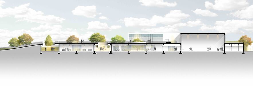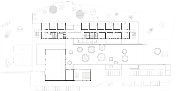 Altro punto di forza progettuale è stata la ricerca di un inserimento organico della scuola nel contesto insediativo: il progetto del parco integra verde ed arredo con aree dedicate ad attività ludiche e ricreative grazie alla presenza di orti didattici, di un giardino d’inverno ed un parco musicale a supporto delle attività scolastiche e interdisciplinari. Il complesso accoglierà infatti non solo i nuovi spazi didattici ma anche un auditorium, una palestra e una biblioteca condivisi con la cittadinanza: la scuola diventerà cosi un vero e proprio centro civico, stabilendo una forte connessione con il quartiere e la città. Secondo le richieste di progetto e le direttive del piano nazionale del MIUR in merito alla Scuola digitale, nel plesso saranno messe in pratica nuove modalità didattiche, improntate all’utilizzo di sistemi tecnologici avanzati che prevedono l’adozione di contenuti digitali, condivisi e informatizzati.