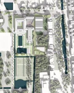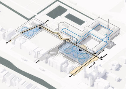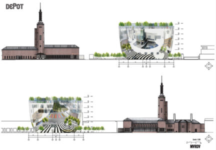 Gli interventi del Boijmans Van Beuningen non terminano con il Depot. Il museo è infatti il perno di un sistema di vari interventi avvicendatisi nel tempo con l’obiettivo di creare un “museo-città” di architetture evocative capaci di contraddistinguere l’identità di Rotterdam. La sede storica è stata realizzata in più fasi: il nucleo originario (Ad Van der Steur, 1935); il primo ampliamento (Alexander Bodon, 1972); il padiglione Van Beuningen – de Vriese (1991 Hubert-Jan Henket, 1991); le nuove gallerie (Robbrecht en Daem, 2003). Nel tempo il museo è diventato labirintico e introverso; così, per risolvere i problemi logistici e ampliare e restaurare il complesso, è stato bandito un concorso internazionale vinto nel 2019 da Mecanoo. La proposta riconnette l’intero sistema partendo da un nuovo passaggio trasparente che, serpeggiando organicamente tra le ali di Van der Steur e Bodon, proietta il museo sul giardino e sulla città. Il passaggio garantirà anche un nuovo ingresso su Museumpark, introducendo un nuovo padiglione espositivo nell’attuale parcheggio delle ville sul Westersingel, diventando così il perno della connessione con le altre istituzioni del parco. Il completamento del cantiere, avviato da pochi mesi, è previsto per il 2025; seguirà l’allestimento, con l’obiettivo di riaprire il museo a Pasqua 2026. Durante i lavori la collezione sarà esposta al Depot, mentre alcune opere viaggeranno in tutto il mondo grazie al progetto “In Transit”. Il costo dei lavori è stato calcolato secondo due scenari, uno di base stimato in 168,5 milioni e uno più ambizioso da 223,5 milioni. Verso questo secondo obiettivo si sta orientando la Municipalità, alla ricerca di finanziamenti esterni per concretizzarlo.
