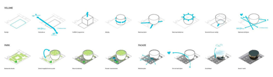 MVRDV ha scelto di dialogare con le preesistenze e integrare l’edificio nel contesto sia proponendo un impianto che, per contenere l’ingombro a terra, s’allarga gradualmente ai piani superiori, sia attraverso il rivestimento a specchio del volume circolare che riflette e deforma il verde, le nuvole e lo skyline urbano, suggerendo la rilettura di uno dei capolavori del museo: la “Torre di Babele” di Pieter Bruegel il vecchio (1560 circa). In copertura, la terrazza giardino a oltre 35 m di altezza, con il suo piccolo bosco di betulle, crea un ideale collegamento col verde sottostante e offre una vista panoramica.