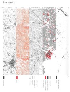 Percorsi, dunque, che sembrano snodarsi lungo direzioni diverse, quasi antitetiche. Più lineare e rigoroso quello degli atlanti narrativi a cura di Chiara Cavalieri e Paola Viganò (HM the Horizontal Metropolis. A radical project, Park Books, 2019, 232 pagine, 38 euro), la cui pubblicazione organizza e sintetizza materiali già diffusi, con una mostra a Losanna nel 2015 e alla Biennale di Venezia del 2016, e che sviluppa una ricerca iniziata insieme a Bernardo Secchi. Sono 5 le regioni emblematiche – le aree metropolitane di Boston e di Huangzhou, i territori svizzeri nei pressi di Losanna e del Vallese, le pianure venete dell’entroterra veneziano – ad essere raccontate attraverso un processo stratificato che unisce immagini fotografiche (aeree ma anche on the road), mappe interpretative di fenomeni socio-economici e, soprattutto, modelli fisici (esplicitamente ispirati a quelli di Frank Lloyd Wright per Broadacre City). L’approccio più innovativo sta poi nella serie di affascinanti disegni a colori tenui che sperimentano l’integrazione dello sguardo planimetrico con l’estrusione assonometrica di alberi, edifici, mezzi di trasporto. Questi sguardi e questi diagrammi diventano un’esplorazione di quella dimensione fortemente contemporanea che le curatrici definiscono come metropoli orizzontale e che descrivono come una forma di progettazione in tre capitoli/episodi: persone e luoghi, misure, un progetto radicale.