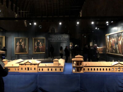 L’atmosfera buia e intima, ricercata ed elegante – ottenuta attraverso un allestimento con grandi elementi metallici a dialogare, non rinunciando al contrasto, con la maestosa spazialità palladiana – conduce in una realtà altra. Per certi versi spiazzante. Siamo abituati a mostre monografiche. Qui invece emerge il senso di un periodo, lontano 500 anni, che ha profondamente rinnovato cultura ed estetica, oltre alla fisicità della città stessa.