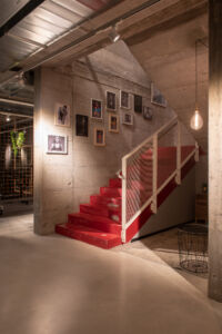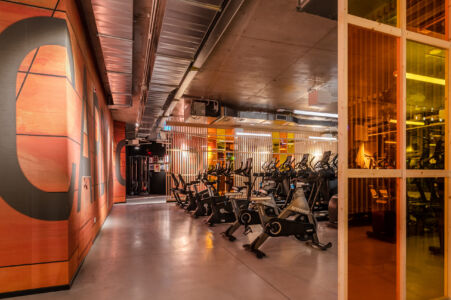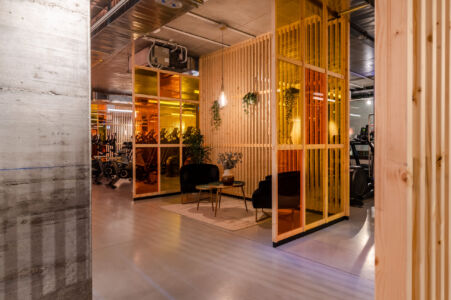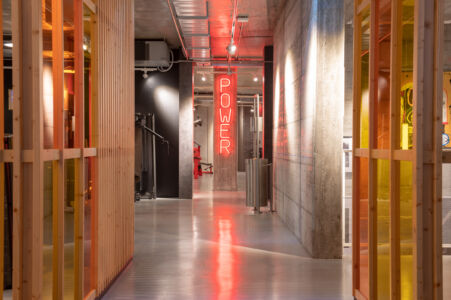 Gli arredi funzionali, innovativi e minimali, sono invece caratterizzati dall’utilizzo di tre materiali – cemento, legno e vetro – che conferiscono agli spazi un carattere industriale e un’essenzialità linguistica. Particolare cura è rivolta anche al progetto di lighting design, al fine di accrescere il benessere nei frequentatori, creando un’atmosfera coinvolgente, accessibile e accogliente. Altrettanta attenzione è stata prestata all’insonorizzazione, con l’inserimento di contropareti e massetti acustici, onde evitare la propagazione di vibrazioni e rumori nei vari ambienti.